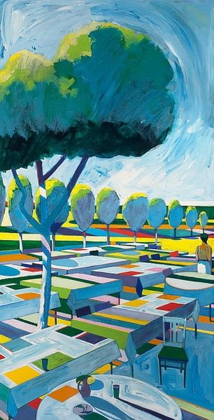 René Magritte created this painting, “The Great Century,” with oil on canvas. The immediate visual experience is of structured space and geometric order. The composition is divided into distinct horizontal layers: a textured stone wall, a verdant lawn flanked by trees, and a grid-like sky. The figure in the foreground, with his back turned, embodies the painting’s formal tension. Dressed in black, the figure is facing away, denying us a personal connection. He is a formal element, and his placement creates a powerful sense of estrangement. This sense of distance is compounded by the surreal sky, which destabilizes the entire scene, transforming the naturalism of the trees and lawn into a dreamlike tableau. Magritte’s surrealism here engages with poststructuralist ideas. The bowler-hatted man becomes a signifier stripped of a fixed meaning, opening the artwork to ongoing interpretations. This emphasis on form encourages us to contemplate how meaning is created not through the representation of reality, but through the artwork's structural composition.