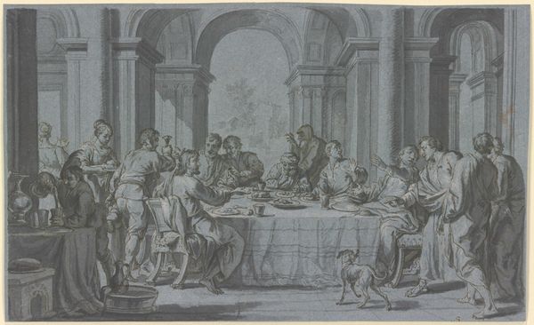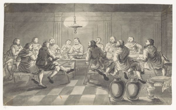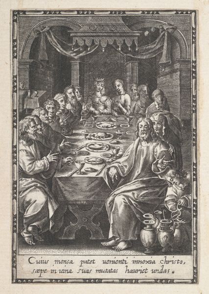 This anonymous print depicts the Last Supper, an event laden with symbolism and profound emotional weight. At the heart of the scene, we see the distinct halo above Christ’s head, a symbol of holiness and divinity. It evokes the spiritual significance of the moment and marks a departure from earthly concerns. Note the presence of bread and wine on the table, potent symbols of Christ's body and blood. They signify sacrifice and redemption, echoing through centuries of religious art. The gesture of outstretched hands, seen in countless artistic representations, serves as a silent announcement of destiny. This primal, almost theatrical expression, conveys a range of emotions, from anticipation to resignation, engaging viewers on a deeply subconscious level. This scene, recreated throughout history, serves as a powerful reminder of the enduring human quest for meaning, constantly reshaped by cultural memory.