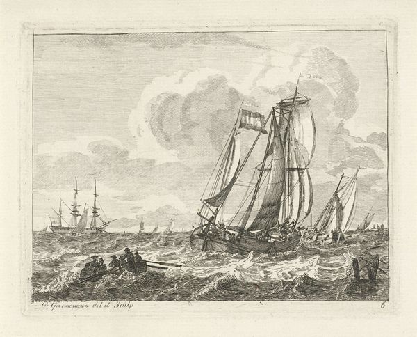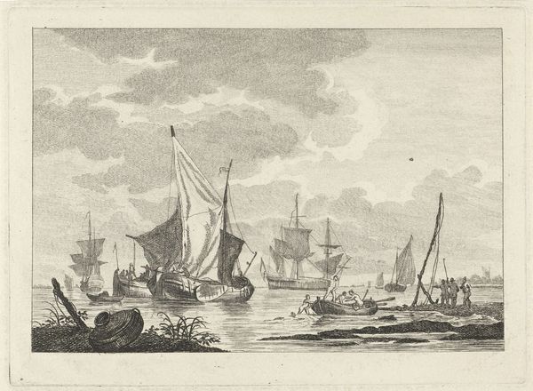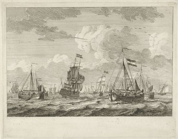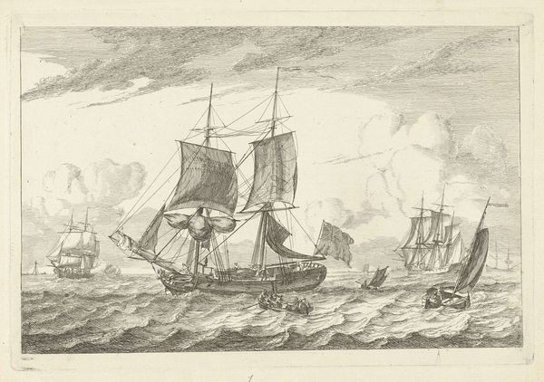 Curator: Let's turn our attention to this 1795 etching by Gerrit Groenewegen, titled "Zeegezicht met diverse schepen"—or "Seascape with Various Ships." Editor: My first thought is: what a dynamic scene! Despite the limited tonal range achievable through etching, it's teeming with activity and the light reflecting off the water really enlivens it. There's a constant state of change implied in the waves and clouds. Curator: The texture indeed is remarkable. Groenewegen really demonstrates the range of linear etching. Look closely, and you will see how the varying densities and directions of lines articulate the forms of the ships, the swell of the water, and even the overcast sky. These ships were the engines of the Dutch Golden Age. Editor: Absolutely, and observe the careful symbolism deployed: each vessel seems weighted with stories of trade and exploration; each sail pregnant with both hope and potential risk. One sees these kinds of ships and understands the era's deep connection to the sea and a belief in harnessing its power for commerce and perhaps colonial expansion. Curator: Thinking about that expansion: it is quite possible that these ships were used for transporting spices and textiles to the Netherlands. Materials transformed from their raw state in one part of the world into valuable commodities through global trade. The act of etching too, a method of transforming metal into image, echoes this process. Editor: Good point about that tension between natural material and high-value end product being intrinsic to the very creation and depiction of these merchant fleets. The flags—albeit difficult to discern—suggest national identity, a driving force in shaping colonial material acquisition at this point in history, I imagine. The whole vista feels symbolically charged. Curator: It certainly pushes one to reflect on Dutch maritime power, trade, and the transformation of global material flows that shaped this era. Editor: It offers a sobering reflection on our own present. I found it aesthetically impressive and conceptually thought-provoking. Curator: I concur! It is remarkable how much information and cultural memory Groenewegen could load into an etching that fits within such a small space.