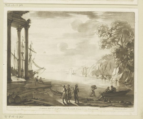 Curator: This is Richard Earlom’s engraving, "Coastal View with Ruins and Jonah and the Whale," likely from 1777, currently held here at the Rijksmuseum. Editor: It's so evocative! The monochrome palette really lends this scene an ancient, almost mythical quality. The classical ruin on the left paired with that whale...there is something almost mournful, perhaps speaking to the temporal nature of empires and the enduring power of myth. Curator: What fascinates me is Earlom’s role as the engraver, interpreting another artist's original design – Claude Lorrain, if the notation on the work is accurate. The etching and engraving process involves labor, skill, and time – layering meaning in how a landscape gains representation. It underscores art-making as an inherently social process. Editor: Indeed, and situating it in its social context allows us to see how images function and what kind of narrative and ideology they propagated. The ruin itself stands for a nostalgia and interest in antiquity that often masked colonial desires and projections of power, with Jonah possibly being coded as an enslaved African being swallowed by the imperial force embodied as Leviathan. Curator: The printing technology, like the mezzotint style, enables replication and circulation of this composition. Its material form gives insight into patterns of taste and commerce. Whose homes might have displayed these views? What economic structures supported their production? Editor: These are crucial points. By examining Earlom’s print as a commodity, we gain a critical insight into the broader social and cultural milieu in which such imagery played a significant part, influencing social identities and political positions. How can this print expand our understanding of myth? Curator: It speaks to me of the industrial processes of art production and consumption. And I return to Earlom's expert translation of tones and textures of the scene into precise linear details – this highlights how essential technical skills are to both enabling and mediating artistic meaning. Editor: It highlights so many intersectional aspects. It challenges us to view our own contemporary artistic and economic production from the outside as well as within! Curator: It is always vital to connect our critical thinking about history with present urgencies. Editor: Precisely, to re-evaluate. Thank you for your expertise.