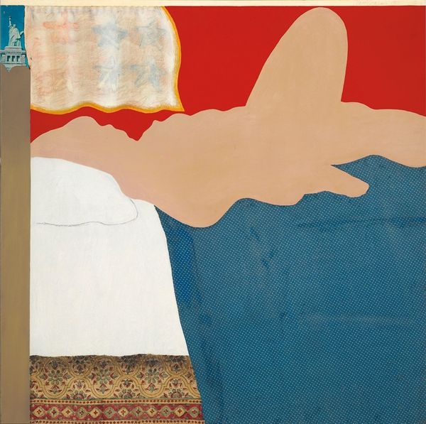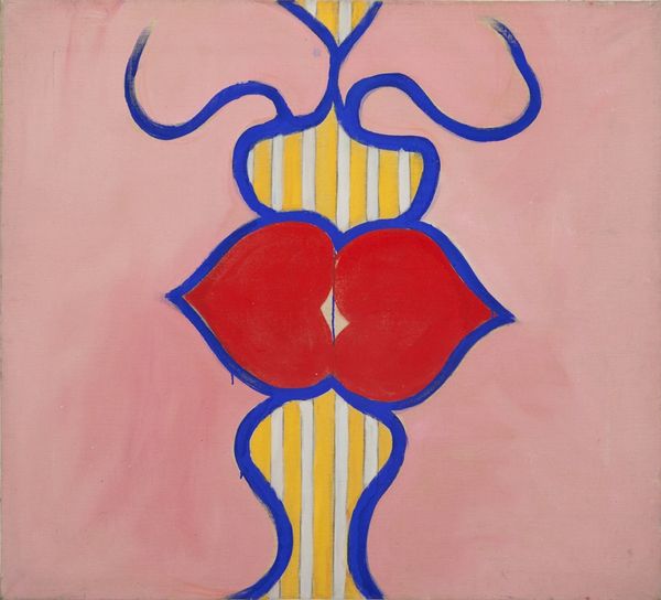 Editor: This is "Oi Yoi Yoi" by Roger Hilton, painted with oil on canvas. The composition feels both fragmented and bold. What formal elements stand out to you? Curator: The stark juxtaposition of red, blue, and black against the unpainted canvas creates a visual tension. Observe how the planes intersect, denying spatial illusion. Hilton employs line to define form. What does the absence of traditional modeling suggest? Editor: Perhaps a focus on pure form over realistic representation? I'm also curious about his use of underpainting. Curator: Precisely. Note how the visible underpainting contributes to the overall flatness and emphasizes the material reality of the canvas. This reveals process over polished finish. Editor: So, it’s not just about *what* is depicted, but how the paint itself creates meaning. Thank you. Curator: Indeed. By analyzing the formal components, we discern the artist's intent and experience the artwork's unique visual language.