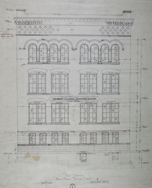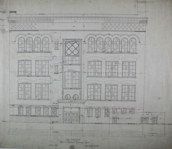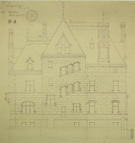 Editor: Here we have the side elevation drawing for the Bryan Lathrop House in Chicago, created around 1892 by McKim, Mead & White. It’s just a very delicate drawing, almost ghostly, on what looks like aged paper. It's so technical, yet the hand-drawn quality gives it a personal feel. What stands out to you when you look at this piece? Curator: It whispers of ambition, doesn’t it? It’s more than just a blueprint; it’s a dream rendered in precise lines. You see, architecture isn’t just about buildings; it's about shaping society, leaving a mark. Look at the details—the careful notations, the scale markings—someone envisioned an entire lifestyle here. Do you get a sense of the people who would inhabit this space just from these lines? Editor: I suppose I can see that a little bit! It’s so different from contemporary architecture; it’s like a time capsule of living in the late 19th century. The formality is kind of overwhelming! Curator: Exactly! Overwhelming formality by design. Architecture is always communicating something, it is always persuading us about power and influence and belonging. That oval window… it’s a small flourish of rebellion, breaking up all the straight lines and the regimentation. It has so much to say in such a small shape. What a metaphor! What kind of impact does a building like this, literally constructed from an image such as this, create on its city? Editor: I see what you mean. So much more than just bricks and mortar, right? It’s fascinating how a simple drawing can hold so much social meaning and aspiration. Curator: Indeed. It's like looking at a seed and seeing the entire forest contained within.