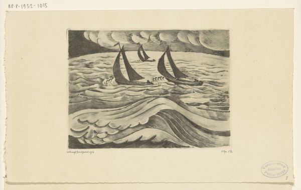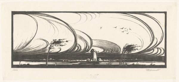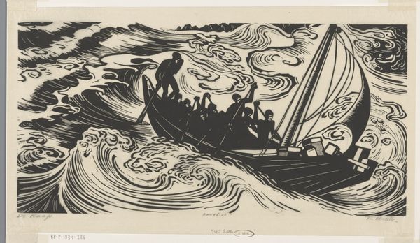 Editor: This woodcut, titled "Orkaan," was created in 1921 by Johannes Frederik Engelbert ten Klooster. The intense contrast really grabs me – it’s dramatic. The churning sea dominates the composition. What can you tell me about this work? Curator: This print speaks volumes about the artist’s reaction to the socio-political storms brewing in Europe at the time. Can you see how the violent waves and looming dark clouds might represent more than just a literal storm? Editor: So, the storm could be a metaphor? Maybe for the unrest after World War I? Curator: Precisely. Think about Expressionism as a movement. Artists sought to express inner emotions rather than represent external reality. The simplification of form and stark contrast amplifies the feeling of anxiety, but who is most at risk in times of turmoil, when the "Orkaan" rages? Editor: I guess those on the margins, people without power, or the working class. I didn’t notice at first, but the buildings in the background seem vulnerable and exposed. Curator: Exactly! Notice how ten Klooster uses geometric shapes to depict not only the waves but the jagged lightning and houses, thus making the scene appear even more destabilized. What message do you think he was hoping to convey to viewers? Editor: That nature, or rather societal forces, can be destructive and uncontrollable, and that those in positions of authority often don't see or even cause this destruction? Curator: It's definitely food for thought when considering art’s potential as social commentary. Hopefully it sparks some difficult but necessary dialogue about whose voices we elevate, and what perspectives get left out when depicting societal turbulence. Editor: It definitely will. Seeing art in this way makes me realize how blind I've been to the message and voices embedded within.
