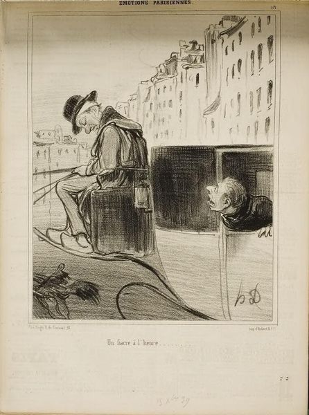 Curator: Honoré Daumier's lithograph, "For a beautiful view, here's a beautiful view!...", offers a satirical glimpse into bourgeois life. Editor: It strikes me as a bit melancholic, actually. The city feels distant, almost dreamlike, and the figures seem isolated despite being together. Curator: Daumier often critiqued the aspirations of the middle class. The text beneath suggests the man boasts about his property and even spies on his wife's potential infidelity, exposing hypocrisy. Editor: There’s something sad about that relentless need to possess and control, isn’t there? It feels like the flute player is trying to make the view a little better. Curator: Precisely. Daumier's social commentary uses art to question power structures and the illusion of happiness they perpetuate. Editor: It's amazing how much emotion and thought Daumier could pack into a simple lithograph. The work feels both timeless and deeply rooted in its era.