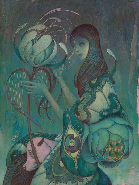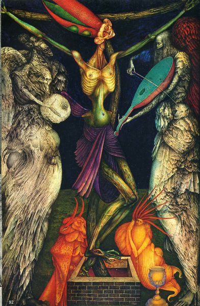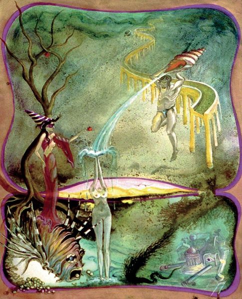Lubo Kristek made "The Consumption of the Priest" with what looks like thin layers of watercolour or maybe acrylic glazes, it is hard to tell. The colours are wild and otherworldly: purples, reds, yellows. The priest is being eaten, metaphorically, by a mermaid, or perhaps rescued. I am drawn to the eerie figures lurking in the background, all skinny bodies and knowing looks. And up above, a kind of floating landscape where birds become bones. I love the way Kristek lets the paint bleed and drip, embracing the accidental. There's a real sense of letting go, of trusting the process. Look at the way the mermaid’s tail fades into the water. Is it paint, or is it magic? This kind of image-making reminds me of Hilma af Klint, but with a darker, more surreal edge. It's this ambiguity, this willingness to embrace the strange, that makes art so endlessly fascinating.