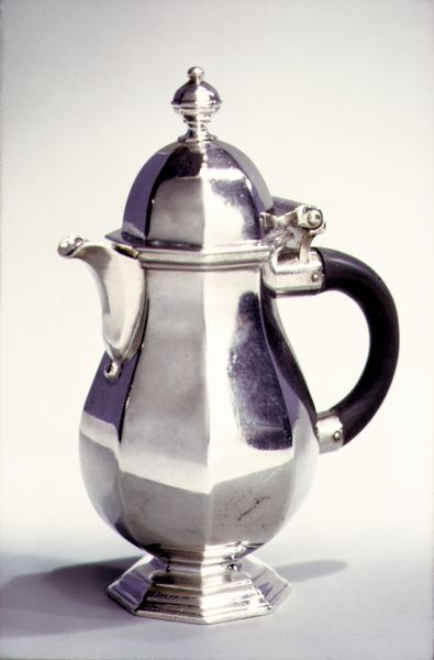 Curator: Standing before us is a “Jug with cover,” crafted by James Fraillon around 1717-1718. It's a striking example of early 18th-century silverwork. Editor: My initial impression is one of cool formality, a vessel hinting at rituals and hierarchies. The monochrome palette amplifies this feeling; it is not just silver, but the *idea* of silver, of wealth, of prestige. Curator: Absolutely. Silverware like this was intensely tied to displays of power. This jug, resting in the Metropolitan Museum, would have been part of a larger table setting intended to impress visitors. Consider the social dynamics at play – the careful selection of guests, the strategic arrangement of these objects, all reinforcing status. Editor: I'm curious about the social narratives around who *wasn't* at that table. The shine of the silver throws a shadow; a reflection of those excluded from such gatherings. Who labored to produce this object, and how might their absence speak volumes? Curator: Precisely. These luxury objects were tools within very structured societal hierarchies, often dependent on labor forces whose contributions were intentionally obscured. Looking closely, we see etched details near what might be a coat-of-arms - evidence of the families these pieces served. Editor: A subtle reminder etched right into the vessel of inherited power and lineage. What do you make of the overall form, almost architectural? Curator: Its lines borrow heavily from contemporary architecture – particularly the emerging Palladian style popular at the time. It embodies notions of order and enlightenment ideals about reason and progress. Editor: Perhaps even subtly weaponizing beauty. Objects such as this silver jug served a political role, establishing norms and reinforcing the exclusion and alienation of othered or underprivileged social groups. It begs us to think critically about what artifacts were elevated and showcased within art institutions like the Met – and for whose benefit. Curator: Reflecting on this jug, its smooth surface can become a mirror reflecting on wealth, power, and the people historically distanced from its benefits. Editor: And in contemplating those reflections, perhaps we begin the challenging work of deconstructing antiquated systems of power, demanding equitable redistribution, so that the shadows once cast by luxury, privilege, and exclusion finally begin to fade.