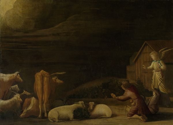 Curator: Ah, Ditlev Blunck's "The Vision of the Prophet Ezekiel," painted in 1830. It’s currently held here at the SMK, made with oil paint. Quite the dramatic history painting, wouldn't you say? Editor: It strikes me immediately with its dark and brooding quality. The figures are languid, almost melting into the landscape, which feels both sheltering and a little oppressive. Is that supposed to be the Almighty floating above? It looks terribly uncomfortable for everyone. Curator: Yes, that’s meant to be the divine vision. Blunck aimed to capture that precise moment of religious ecstasy described in the Book of Ezekiel. Editor: Ecstasy. It’s more like an exhausted Sunday afternoon. I am interested in how the light is captured on this piece. What do we know about Blunck's choice of oil and layering process here, and the material practices of academic art at the time? What are we meant to make of the almost academic use of a very specific type of fabric around some figures? Curator: Materially speaking, Blunck trained in the Danish Royal Academy, and you see that influence clearly. He’s playing with dramatic contrasts—light and shadow—with a strong attention to form. Remember, he would have likely grounded his pigments by hand. In this historical and religious genre the depiction of rich garments signals social stature. This would indicate those within Ezekiel's vision as important in a cultural-historical context. I wonder though... Editor: Wonder what? Curator: Whether those rich materials make sense in that landscape, in the hands of that populace? Aren't they quite overwrought and disconnected to the place of rest in which they find themselves? Editor: Right. They are signifiers of another order, literally dropped in and yet they tell a clear class narrative if one begins with a specific gaze. Curator: Perhaps Blunck wanted to remind us that even in divine visions, the earthly distinctions remain? After all, visions have social contexts as well. Editor: Or how material processes and their representation cannot escape existing political realities of art practice and social codes, ha! Even prophets aren’t exempt from the class struggles embedded in the materials themselves. Anyway, what a way to reflect on historical painting, hey? Curator: Absolutely. It offers layers upon layers of things to consider.