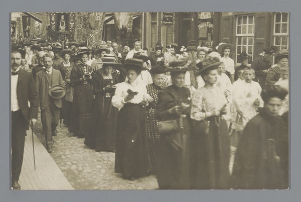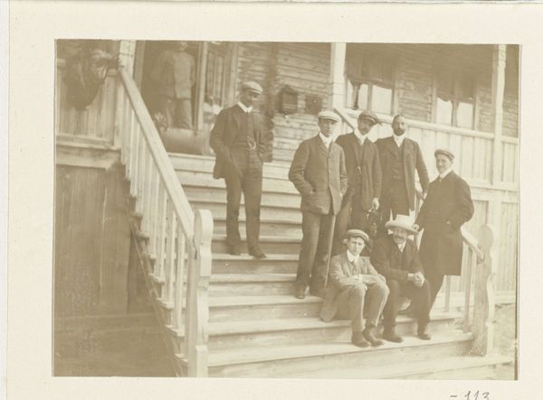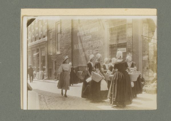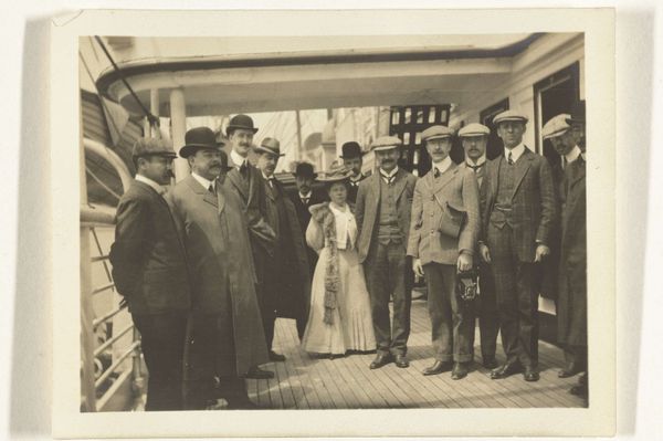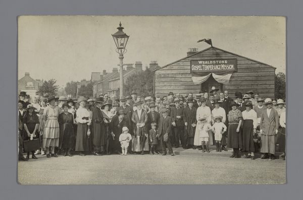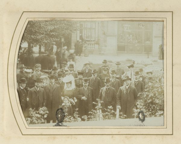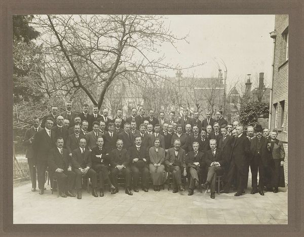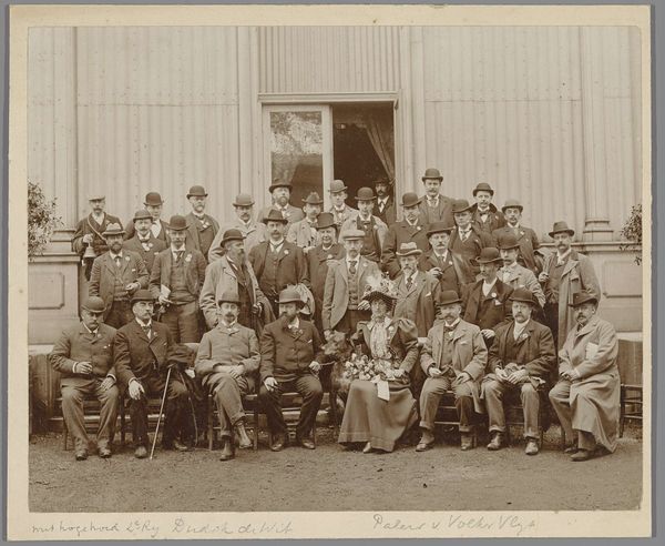 Editor: This photograph, a gelatin silver print from 1928, captures the staff of the 'Gelria' umbrella factory with the director, Arthur Schnitzler, and his wife. The subjects have such grave expressions! What can we unpack from this group portrait, aside from the somber atmosphere? Curator: Let's start with the umbrellas themselves—or rather, the *absence* of them. A photograph of an umbrella factory’s staff that omits their product raises questions. How does the act of photographing them—the material conditions and the photographic process itself—become a stand-in for their labor? This image captures not the thing they make, but them as a unit of labor. Editor: So the photo becomes about the workers themselves rather than what they produce. How would that affect its meaning? Curator: It highlights their collective role in production and how photography functions within the social and economic context. These gelatin silver prints, relatively inexpensive and reproducible at the time, allowed for mass image creation. Note also the presence of the building itself. Doesn't its architectural presence dwarf the individuals? It certainly makes the raw building materials, especially brick, stand out as symbols of industrial permanence, maybe even capitalist stability, dwarfing the workers. Editor: I never thought of it that way! So, it is less about umbrellas and more about how images and industry shape lives. Curator: Precisely. This isn’t just a simple record; it is a document intertwined with the means of production and representation. The employees aren't showing their wares, but proving, in a photograph—the thing that's being consumed—that they're at their place of work. Editor: I guess seeing it as a representation of work rather than an umbrella ad changes everything! Thank you for sharing your perspective on the subject! Curator: Absolutely. Consider how labor and material culture converge in even the most seemingly straightforward images.