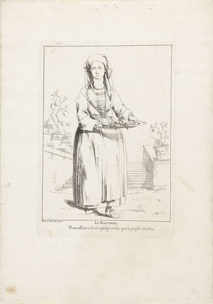 Editor: So, this is “Germana,” an engraving by Enea Vico from before 1558. The figure has this strange detached air about her, almost like she's a symbolic stand-in rather than a person. I wonder, what do you see in this piece? Curator: I see the weight of cultural memory etched into this image. The figure's pose, with one hand raised in what seems like an offering, connects her to the tradition of representing personified places or ideas, specifically of “Germania”. But note the details. The dress and purse suggest a different origin from Roman-style depictions of subjugated nations; instead it gestures towards the evolving concept of what constituted ‘Germanic’ identity. What feelings are evoked for you when considering how cultures claim and define themselves, even through symbolic images? Editor: Well, there’s definitely something intentional about the image – the way the artist included the little sign labelled ‘Germana’. It does feel like a constructed identity. I also keep looking at the purse – is there significance in it? Curator: Absolutely. These details become visual signifiers in the broader narrative. It is more than mere adornment, but potentially symbolizes economic power or status, rooted in local culture rather than colonial ambition. Do you notice other visual echoes that link this image to related engravings of this period? How do these related images help you contextualize Vico's rendering of ‘Germana’? Editor: I suppose I’m seeing it as a way to almost…invent a past or give tangible shape to a burgeoning national idea, but it’s interesting to see it reflected here. This image makes one consider a modern country being formed during this historical period and makes us re-think the notion of national identity. Curator: Precisely. So we can see it almost becomes an archaeological site through which we can explore not just how people thought about geography, but identity as well.