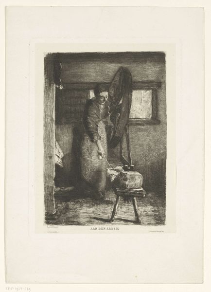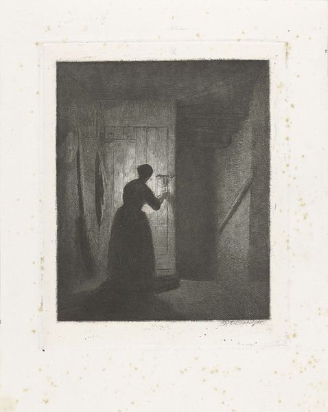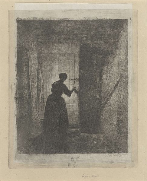 This etching, "Vrouw voor een deur," or "Woman at a Door," was made by Reinier Craeyvanger. Etching is an intriguing process. The artist covers a metal plate with a waxy, acid-resistant substance, then scratches an image into it with a needle. Next, acid eats away at the exposed metal, creating incised lines. The deeper the bite, the darker the line will appear in the print. Finally, the plate is inked and pressed onto paper. In this print, we see the effects of etching: a velvety texture and rich tonal range. Craeyvanger captures the woman's quiet moment, highlighting the details of the simple interior, perhaps alluding to the labor carried out within. By choosing etching, with its reliance on skilled handwork, the artist draws our attention to the value of craft, reminding us that even everyday scenes are imbued with the marks of human skill and effort.