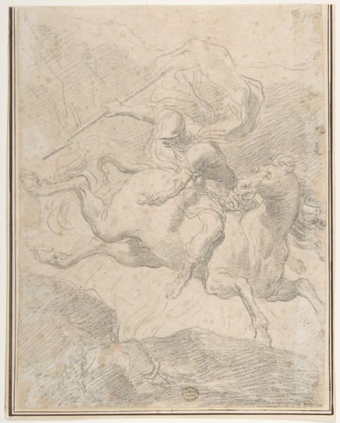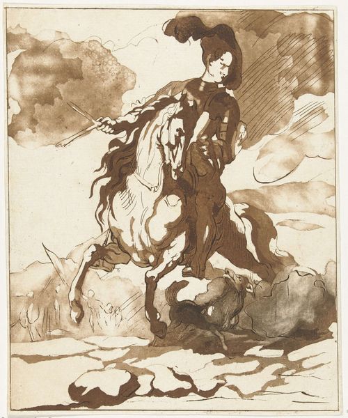 Anthonie van den Bos created the drawing *Ruiter met hond* sometime during his lifetime, which stretched from 1763 to 1838. Van den Bos lived during a period of immense social and political upheaval, including the rise and fall of Napoleon. Rendered in brown ink, the artwork depicts a man on horseback accompanied by a dog. It speaks to traditional images of masculinity and power often associated with equestrian portraits. However, there is a notable absence of context; the rider's expression is obscured, and the landscape is vaguely defined. This ambiguity invites us to consider the complexities inherent in representations of authority. Does the somewhat frantic image of the dog disrupt the traditional composure associated with such portraits? How might the artist's own experiences and beliefs have influenced his approach to this well-established genre? The drawing prompts a dialogue between historical expectations and individual expression. It reminds us that identity is not static, but shaped by the ever-shifting currents of personal experience and cultural change.