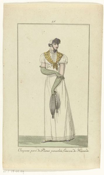 This fashion plate, "Robe à Panier en Satin café!" by Francisco Javier Gosé, was made in 1912 for the Journal des Dames et des Modes. It feels as though it's made with soft pencils, or maybe even watercolor. The color palette is very muted, dominated by browns and creams. This approach to the piece lends it a gentle, almost dreamy quality. The material aspects, particularly the texture, invite a slow, intimate viewing. The lines are delicate, almost tentative, and there's a softness to the shading that gives the image a three-dimensional feel. The brushwork is subtle, almost invisible, allowing the colors to blend seamlessly into one another. The gentle tones of the dress contrast with the solid black of the dog, drawing your attention to the relationship between the high fashion of the day and its accoutrements. You can see a reference to the work of artists like Manet, and maybe even Degas here. These kinds of images are part of an ongoing conversation, and invite us to look closely and find our own interpretation.