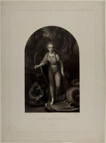 Curator: Achille Louis Martinet gives us "The Virgin at the Redemption," now part of the Harvard Art Museums' collection. Editor: It’s a bit sepia-toned, isn't it? Instantly makes me think of old photographs and faded memories. Curator: The image carries a powerful weight, doesn't it? The Virgin, tenderly holding the child, is framed by symbolic figures. The palm fronds above her head signal victory and martyrdom. Editor: Yes, the fronds feel almost protective, while the cherubs add this gentle, ethereal touch. It feels like a very human moment, softened by the promise of something greater, or perhaps something already lost. Curator: The composition and the figures invoke a lineage of Christian iconography. Editor: It has an antique, romantic, and nostalgic quality, really. There's a dreaminess to it that's hard to shake off. Curator: Absolutely; these images were designed to be impactful, but I think Martinet captures the humanity of the subject. Editor: That’s precisely it—a soft dream of humanity. Very nice.