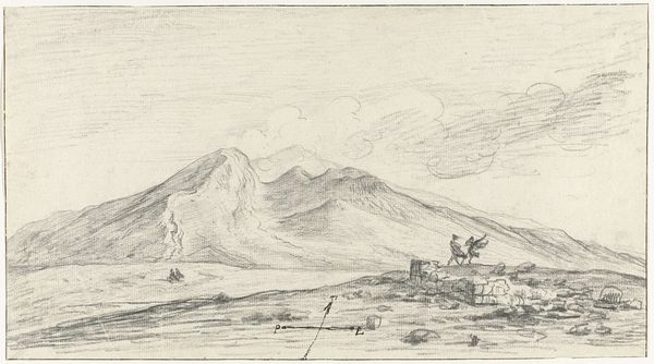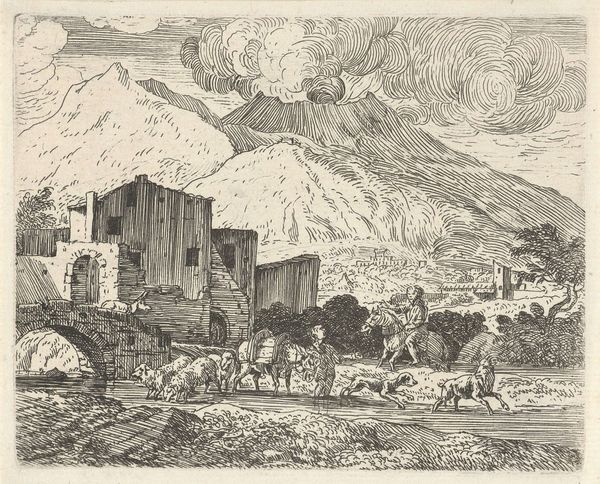 Stefano della Bella created this print, “Two Horsemen Descend a Hill,” sometime in the mid-17th century. The composition invites the eye to wander across a textured landscape through the use of line and perspective. The riders and lone walker in the foreground are dwarfed by the imposing mountains and the distant castle. Note how the intricate linework defines the forms, creating a sense of depth and distance. The scene is neatly structured, with the mountain acting as a compositional anchor. This structure subtly implies a hierarchy, emphasizing the grandeur of the natural and built environment over the human figures. The print uses space and scale to destabilize traditional heroic narratives. It encourages us to reconsider the relationship between humanity and nature.