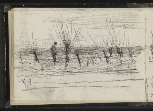 Anton Mauve made this sketch of a Dutch heath with charcoal on paper. The lone figure, seen from behind, accentuates the vastness and emptiness of the landscape. Mauve belonged to the Hague School, a group of Dutch Realist painters who reacted against the romanticized landscapes of earlier art, choosing instead to depict the everyday life and scenery of the Netherlands. The Hague School was deeply influenced by the Barbizon School in France, whose members also focused on painting nature directly. This artistic movement coincided with a time of social and economic change in the Netherlands, including debates about industrialization, urbanization, and rural life. Art historians study such works by reading contemporary art criticism, exhibition reviews, and artists' letters, enabling us to understand the changing social and intellectual contexts that shaped artistic production. Mauve's drawing embodies a desire to capture the essence of the Dutch landscape, reflecting a broader cultural interest in national identity and the relationship between people and their environment.