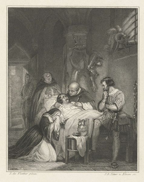 Willem Steelink produced this print, "Young Man Visits the Poet Joost van den Vondel," using etching techniques. The image brings to life a meeting with the famous 17th-century Dutch poet, Vondel, capturing a moment of cultural reverence. Steelink, working in the 19th century, was keen to evoke the Dutch Golden Age. Here, the depiction of Vondel's study, filled with books and scholarly objects, underlines the importance of literature and intellectual life in Dutch culture. The respectful posture of the young visitor and the presence of what seems to be a maid suggests Vondel's elevated social status. Prints like this circulated widely, shaping public perceptions of national history and cultural icons. The detailed rendering of costumes and interiors speaks to a broader 19th-century interest in historical accuracy and the construction of national identity. To understand this work better, scholars might consult period literature, social histories, and the records of art institutions that promoted such historical narratives. By examining these resources, we can better understand the role this image played in shaping collective memory.
