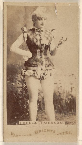 This photograph of Bertie Morris was produced by Allen & Ginter in the late 19th century as part of a series of collectible cards included in packs of Virginia Brights Cigarettes. Tobacco companies often used images of actors, actresses, and other celebrities to market their products, tapping into the growing popularity of mass media and celebrity culture. The image presents Morris in what was considered at the time to be a state-of-the-art bathing suit. The production and distribution of these cards reflect a significant shift in consumer culture in the United States. The rise of advertising, mass production, and the increasing visibility of women in public life all contributed to the popularity of such items. The cards offered a glimpse into the glamorous world of entertainment, while simultaneously promoting tobacco consumption. Understanding these cultural artifacts requires us to consider a range of historical sources, from advertising archives to social histories of leisure and consumption.