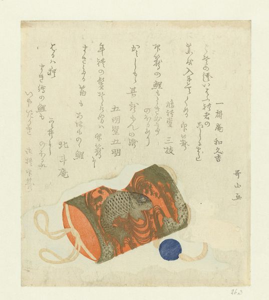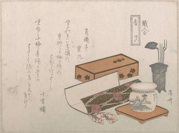 This woodblock print, made by Kubo Shunman, presents a seemingly simple box adorned with patterns and a sugoroku game, revealing intricate layers of meaning through its composition and form. The box, rendered in muted browns, establishes a central geometric form, its flat planes and sharp edges softened by the delicate cloud and character patterns. These motifs, combined with the meticulously drawn bow and drum, engage in a semiotic play, inviting viewers to decode their cultural significance and understand the box not just as a container, but as a vessel of traditional values and social practices. The artist's meticulous attention to detail and the print’s structural clarity serve not merely as aesthetic choices but function within a larger discourse about the relationship between material culture, identity, and representation. The arrangement of elements challenges fixed perspectives, creating an ongoing dialogue between form and cultural meaning, which allows for a continuous process of interpretation and appreciation.