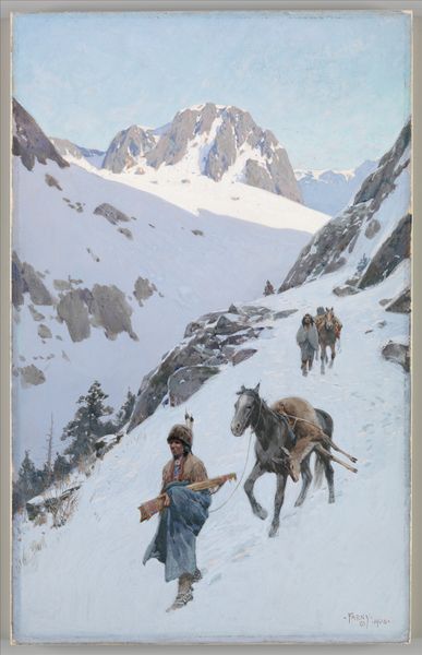 Curator: Here we have "In Hot Pursuit," an oil on canvas crafted by Charles Schreyvogel sometime between 1901 and 1910. It currently resides here at the Metropolitan Museum of Art. Editor: My initial feeling is urgency. There's an almost theatrical intensity conveyed through the charging horse and the figure’s poised weapon. Curator: Schreyvogel was known for his paintings of the American West. He was part of a wave of artists captivated by the romantic allure, but his work also participated in shaping popular understanding of this era. The chase scene evokes the conflict narrative that dominates a lot of Western art from that period. Editor: I'm drawn to the symbolism of the horse itself. Across cultures, horses often represent power, freedom, and even a connection to the wild. This one seems to be an extension of the rider’s intent, embodying his forceful will. Notice the energy emanating from its taut muscles and flaring nostrils. Curator: Absolutely. And it's worth noting that Schreyvogel, though lauded in his time, has faced scrutiny. His depictions of Native Americans have been criticized for perpetuating stereotypes and biased perspectives on historical events. "In Hot Pursuit" presents the chase, but whose land is being fought over? Editor: It’s interesting how the snowy landscape contributes to this drama. White, in many traditions, signifies purity or a blank slate, yet here it's disrupted by the frantic pursuit. It almost serves as a stark backdrop to highlight the loss of innocence or the potential for violence. Look, even a smaller contingent of riders is visible in the distance. Curator: The artistic licensing to reconstruct events comes under fire when considering these images helped inform and solidify ideologies, often at the expense of the people depicted. The staging of events, what details are prioritized versus omitted all lend themselves to further mythologizing of this era. Editor: Examining art like this allows us to face our past more openly. We confront not only the thrilling adventure narrative but also the uncomfortable questions it raises about cultural biases and the lasting impact of visual symbols. Curator: Precisely, acknowledging the complexities is crucial when reevaluating artworks like “In Hot Pursuit” within a modern framework. Editor: Ultimately, art serves as a lens through which we understand our historical trajectory and reflect upon our societal narratives.