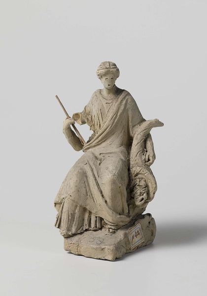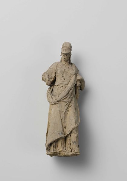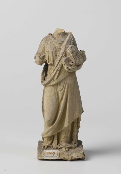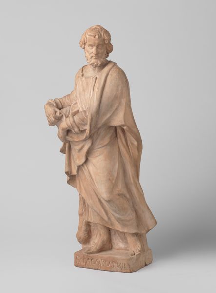 Editor: So, this is Artus Quellinus’s "Saint Peter," carved in wood around 1658. I find the texture of the wood captivating; it seems to convey both strength and vulnerability. What's your take? Curator: The choice of wood is crucial here. It connects Peter, often depicted as a humble fisherman, to the raw materials of everyday life. In the context of 17th-century religious art, what does depicting Peter, who denied Christ, holding the cross imply about the social role of faith? Editor: It makes him seem very human, relatable almost. The rooster at his feet references his betrayal, right? Curator: Precisely. The rooster and the cross act as symbols of shame and redemption, ideas powerfully amplified within the social and political turmoil of the Baroque period. The Catholic Church utilized art strategically, so how might this sculpture serve a propagandistic function? Editor: I guess it reminds the viewer that forgiveness is always possible, a way of reinforcing faith during times of uncertainty. Were sculptures like this publicly displayed? Curator: Absolutely. These weren't just aesthetic objects, but rather visual tools that communicated moral narratives to a broad audience, shaping social behavior and solidifying the Church's power. Do you see a political statement being made by having him hold a ‘raw’ cross versus an embellished or golden cross? Editor: That's a really good point. The ‘raw’ cross says something about the core or fundamental beliefs of Christianity, the sacrifice for others. Thank you, that gives me a different perspective on the role this sculpture would play. Curator: Glad to help, it’s been interesting examining the function of this figure within both the artistic and social movements of the era.