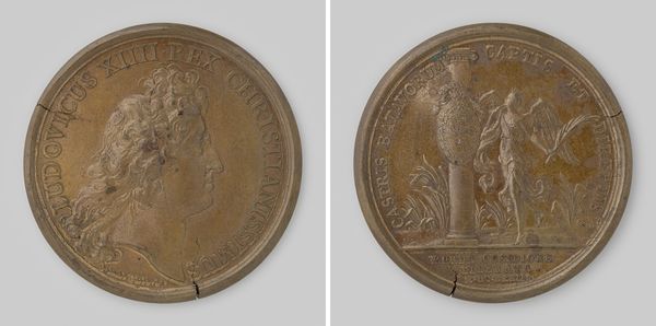 Editor: So, this is "The English and Dutch Fleet Destroyed by the French" by Jean Mauger, cast in bronze in 1690. It depicts a naval battle… on a coin! I’m struck by how such a grand, chaotic event is captured in this tiny, almost peaceful form. What strikes you about it? Curator: You know, I love that juxtaposition, the monumental shrunk down. To me, it’s a perfect example of Baroque propaganda, you see? This wasn't just a pretty picture, but a very pointed message about French naval supremacy under Louis XIV. The artist even inscribed around the coin, boasting of his victory. I wonder if the weight of the bronze feels like power in your hand. What do you think of the composition of the naval ships versus Louis XIV profile on the other side of the coin? Editor: Hmm, I see what you mean. One side displays the portrait of the proud king. It’s like a victory statement to me, showing two defeated forces by presenting the king larger-than-life to the masses. And bronze… there’s a permanence to it. Do you think the choice of material contributes to the propagandistic purpose? Curator: Absolutely! Bronze speaks to timelessness, prestige, and authority. And Mauger’s choice of Baroque style adds to the drama; a visual shout instead of a whisper. Now, does that symbolism enhance or detract from your appreciation of the art? Editor: It makes it more complex, definitely. Knowing the intentions behind the work gives it an added layer, even if I don’t necessarily agree with them! Curator: Precisely. It’s a tiny, shiny history lesson. Art whispers and shouts simultaneously; you just need to listen closely to hear the echoes. Editor: Exactly! Thanks, I hadn’t thought about it quite that way. Looking at historical art with today's eyes creates so much richer meanings than I originally understood!