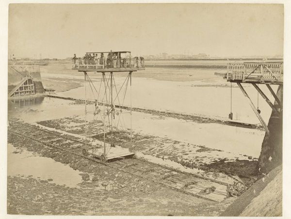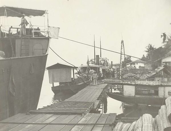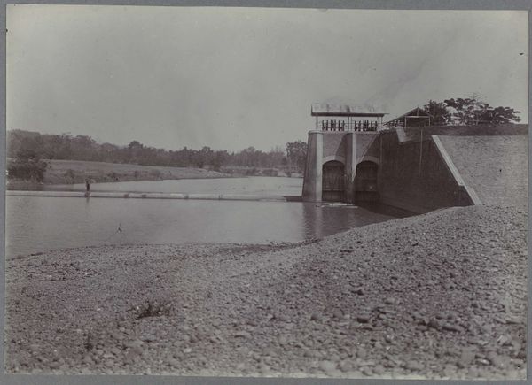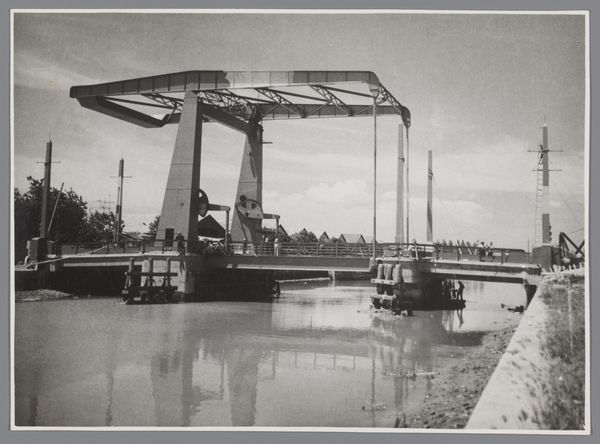 Curator: Let's examine this photograph, "Nederlandse gebouwen in Batavia," circa 1900, a gelatin-silver print. It captures a cityscape dominated by a distinctive drawbridge. Editor: My initial impression is one of stillness. The monochrome palette, the quiet water, it evokes a profound sense of suspended time. There is the colonial space and this very Dutch piece of infrastructure. Curator: Precisely, the formal composition emphasizes a clear distinction between the geometric rigidity of the Dutch-built bridge and the implied chaos of the river. Note how the structural lines draw the eye, compelling attention to its function as a nexus point between different spaces. The clarity reminds us that bridges, as visual structures, also represent movement. Editor: Yet that drawbridge itself is loaded with symbolism. In old Dutch paintings, we often see similar bridges acting as a threshold – a gateway from the known to the unknown. Consider that, here, it divides not only land and water but perhaps also cultures and ways of life in colonial Batavia. Curator: An insightful observation, it creates an intersection with orientalist views. The light, although subtle, is used in interesting ways here as well. It appears even, with an aim to avoid dramatic effect, a tool that may be said to render the scene, from a compositional point of view, accessible. Editor: But that soft light also contributes to a melancholic air, wouldn't you agree? I keep thinking about what Batavia represented - a meeting point, often fraught, between European ambition and Indonesian reality. The presence of the drawbridge is powerful within that history and the gelatin print imbues the image with a vintage aesthetic. Curator: Indeed, and let’s not overlook the water’s reflection, or how its texture adds a layer of complexity, softening the rigid architectural details of the bridge. Also, one wonders what social order existed here in 1900! Editor: In considering such elements, one gets an insight of the orientalist vision, to find and codify an ideal, one in the Western canon, within a very specific local landscape. And indeed, to reveal much about the Dutch preconceptions during the period. Curator: This work offers rich potential to interrogate structural components in art. Thank you, this dialogue proved to be interesting in further unlocking a number of fascinating ideas here. Editor: I concur. It's been enlightening to see how its symbolism operates within and reflects that intricate period.