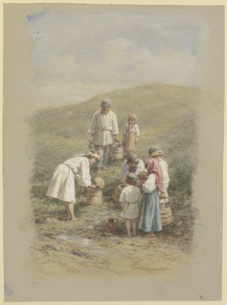 Editor: Here we have Philip Sadée’s “Scheveningse vrouwen bij het nalezen van een gerooid aardappelveld,” painted in 1874. It's an oil painting depicting women gleaning potatoes in a field. The muted colors create a really somber, almost melancholic, atmosphere. What do you see in this piece, considering its time and place? Curator: The painting whispers of resilience and community. Note how the women's labor isn't romanticized. It's presented with an earthy realism. They repeat the tradition of gathering leftover potatoes, which speaks volumes about self-reliance in a changing world, where land ownership shifts, and resources become scarce. This evokes empathy. Do you see anything in the composition, say, like the lighthouse? Editor: Yes, it is faint but in the background and quite symbolic, almost hopeful! Curator: The lighthouse pierces through, connecting with themes of guidance, hope, and a connection to their local Scheveningen. Remember that lighthouses often signal a return to normalcy or direction, so does the placement offer context or add new symbolism? Editor: That's a fresh way to see the work - the light is so subtle. I'd initially missed how it frames everything else. Curator: Precisely! Consider how visual components interact with our psychology. Here, the image implies collective memory in the Dutch people—resilience despite hard times. Its significance is that this artwork shows how, at certain points in time, traditions have been preserved, as they remind future generations. This way of preserving is extremely unique in our vast and developed world. Editor: I didn’t realize how much history and memory could be contained within such a seemingly simple scene. Thank you. Curator: Indeed. Art is never 'just' a picture; it is an encoded story, patiently waiting to be decoded. The role of an artist should not go unstated!