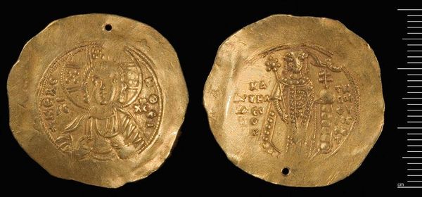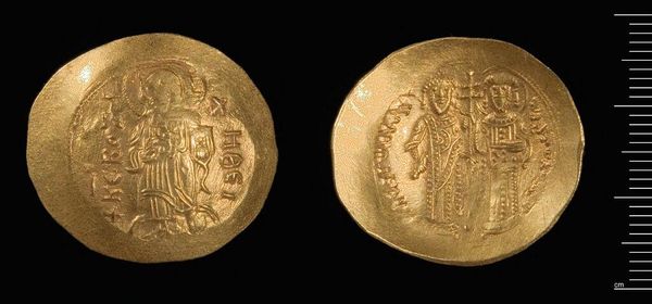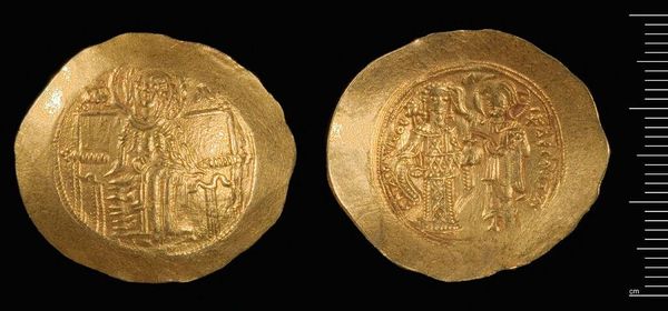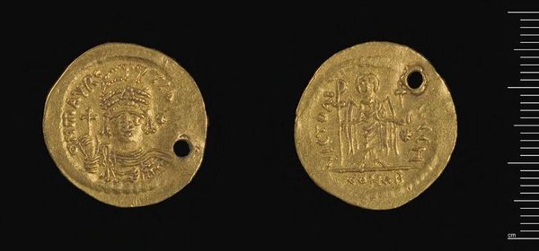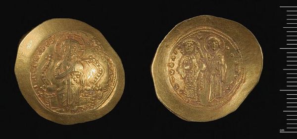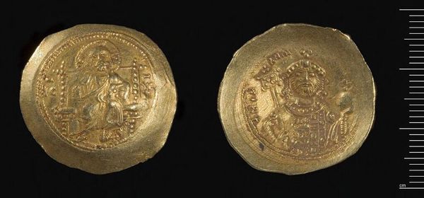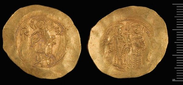 Curator: This is a coin of Nikephoros III, currently held at the Harvard Art Museums. Editor: It has such an archaic feel. The low relief and compact composition give it a feeling of solemnity. Curator: Absolutely. It's fascinating to consider these coins as instruments of power, mass-produced and circulated widely within the Byzantine Empire. Imagine the labor and the control over resources required. Editor: The visual language, too, speaks of authority. The figures are framed centrally, symmetrical. Curator: Precisely! It's a testament to the power of material culture and its connection to the social order. Editor: It is also a simple token of past times. Curator: I agree; such a potent, layered object. Editor: Indeed, a treasure.