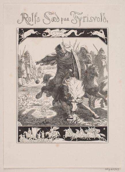 Editor: This is "Skjolds kamp med bjørnen," or "Skjold's fight with the bear," a woodcut engraving from 1852 by H. C. Henneberg. It strikes me as such an interesting depiction of masculinity. I mean, what's with the hug? What’s your interpretation of this image, considering its historical context? Curator: It's fascinating to examine how 19th-century art shaped ideas about Danish identity and power. Consider the revival of Norse mythology and sagas during this period. Henneberg taps into that wellspring. Skjold, a legendary figure, battling a bear, becomes a metaphor for Denmark's struggle against, or perhaps even its embrace of, nature's wildness. Look at the horrified figures in the background versus the direct connection between Skjold and the bear, like an odd, national ballet. What kind of cultural messages do you think this promotes? Editor: Hmmm, you're right. It could be suggesting that the Danish identity embraces bravery and strength through a connection with the raw, untamed elements. It also appears like propaganda, romanticizing a foundational national myth! Is the engraving process relevant here, suggesting an attempt at mass appeal? Curator: Exactly! Engravings, being reproducible, made these national narratives accessible to a wider audience, cementing those very values within popular culture. Also note that in this same period, national museums like the Statens Museum for Kunst where it is now located are also being founded. These things aren't random. How do museums display the work and control who tells that history? Editor: It's almost as if Henneberg anticipated it being in the museum someday! It is all so very self-conscious. Curator: Absolutely! This makes me wonder about the influence of these images on shaping historical memory and national character in Denmark. It certainly has shifted my perception. Editor: Definitely, mine too. Considering the history of the print changes my perspective on how it acts almost like an advertisement for Denmark. Thanks!