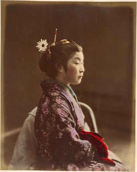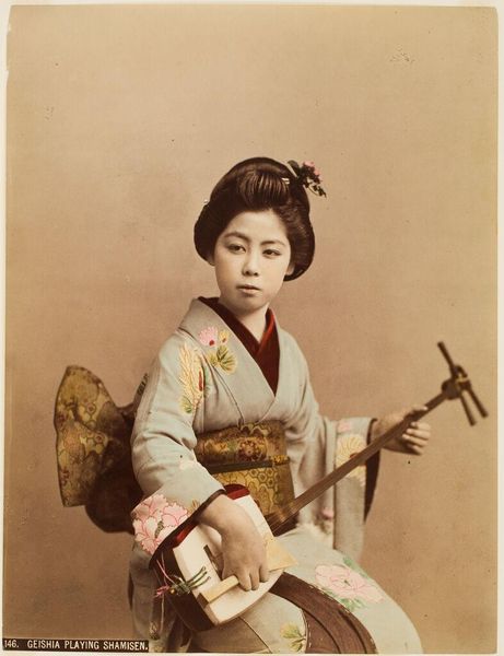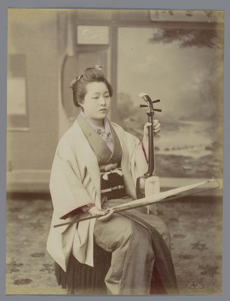 Curator: We are looking at "Dancing Girl Making Paper Birds," an anonymous 19th to 20th-century photograph, currently held at the Minneapolis Institute of Art. Editor: There's a quiet intimacy to it, almost melancholy. The stark white bird pops against the muted tones, drawing the eye immediately. Curator: Absolutely. It is interesting to think about the production. These photographs, hand-colored albumen prints on paper, became a popular commodity. The making of these "souvenir" photos became a local industry for a time, supporting entire communities of artists and laborers. Editor: The photographer expertly frames the subject. Consider the texture, the interplay of lines between the origami bird, the soft folds of the kimono. Her dark hair provides an anchor to emphasize her youth. Curator: This photographic style also challenges boundaries. The sitters came from the lower classes of Meiji Japan. So you might want to ask whether there’s a dissonance here; is this image more staged and a false record, or documentation of real women and labor of this time? Editor: I'd say the contrast between the apparent simplicity of the photograph and the depth of cultural narratives at play is interesting. The single paper crane seems to symbolize larger societal values regarding performance, domesticity, even transformation and hope. Curator: Right. Paper, of course, being one of the core and oldest technologies in Japanese art production. It’s hard to deny the link here to long history of consumption and globalized circulation of materials that made photographs and art available to western consumers. Editor: Whether we foreground form or historical context, it's hard to resist reading more into this deceptively simple photograph. Curator: Agreed. These commercial portraits invite the viewer to consider cultural encounters between Japan and the West, a complex process involving the commodification of artistic traditions.