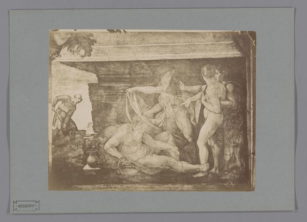 Editor: So, this is a photorealistic print dating back to between 1858 and 1866, of Anthony van Dyck's "The Lamentation of Christ." It's rendered in etching on paper. I find its composition deeply moving, yet the washed-out monochrome creates a sense of distance, like a memory. What do you see in this piece? Curator: This image, layered in historical reproduction, offers multiple entry points. The initial painting, a canonical work of the Baroque, displays a carefully constructed iconography. But in its transition into an etching, it’s gained something new. Notice the subtle rendering of light and shadow. This technique is vital – the grief isn’t just depicted through faces, but etched into the very fabric of the scene, no? It recalls earlier iconic lamentation scenes, but what feelings arise when you think of it being reproduced at the time? Editor: I hadn't thought about that. Maybe a longing for a connection to that historical emotional display that might have felt lacking then? Curator: Precisely! The act of reproduction transforms the initial religious expression into a signifier of cultural memory. Van Dyck originally tapped into existing wells of religious grief, universal pain materialized by specific people. But here, a reproduction of that moment takes center stage – a layering of emotions. Look closer—does the act of reproducing affect how you feel toward it? Editor: Definitely. There’s a vulnerability, like the emotion is now doubly exposed by both Christ’s death and the reproduction of it. It seems that making a copy has, itself, made it vulnerable. Curator: Exactly! This image becomes a palimpsest— layers of cultural encoding and re-encoding creating something new, evoking feelings, time, and historical connections. We look back as people in this piece looked back, and will look back to our current moment at a future date, too. It’s amazing to see history in an image from history. Editor: I’ve definitely gained a new appreciation for considering how an artwork like this accrues meaning and emotion over time! Thanks so much!