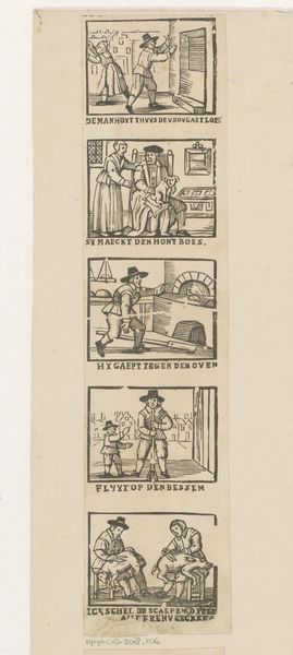 Editor: This print, whose title roughly translates to "Image of seven women fighting over a man's breeches," is an anonymous engraving, likely created sometime between 1700 and 1865. The comic strip-like panels have me intrigued. How do we even begin to interpret such a strange scene? Curator: This image provides a fascinating window into early modern European anxieties around gender roles and societal order. Notice the central struggle for the breeches—what does this usurpation of patriarchal power symbolize in that period? Editor: I guess, at face value, it's funny, and the inscriptions feel almost tongue-in-cheek. Curator: Exactly. The humour serves as a potent vehicle for social commentary. Considering the historical context, these women fighting over trousers – a clear symbol of male authority – can be viewed as a carnivalesque disruption. Where and how were images like this circulating? To what end? What audiences are being cultivated and served by works of this nature? Editor: So, this chaotic scene, rather than just being funny, becomes a symbol of societal tensions and anxieties related to power and gender roles. Curator: Precisely. And the "folk art" aspect deepens its subversive potential. Because these kinds of images would be far more readily disseminated across lines of social class than official or “High Art” prints would. So its political agency becomes magnified exponentially. What could be more potent than a low cost image that might sow the seeds of dissent? Editor: Wow, I had not considered this reading. So, even a seemingly lighthearted image can reveal complex cultural anxieties when we view it through an intersectional lens.