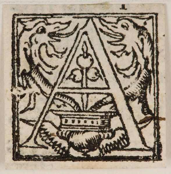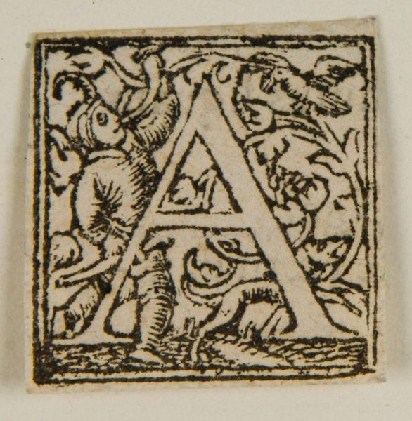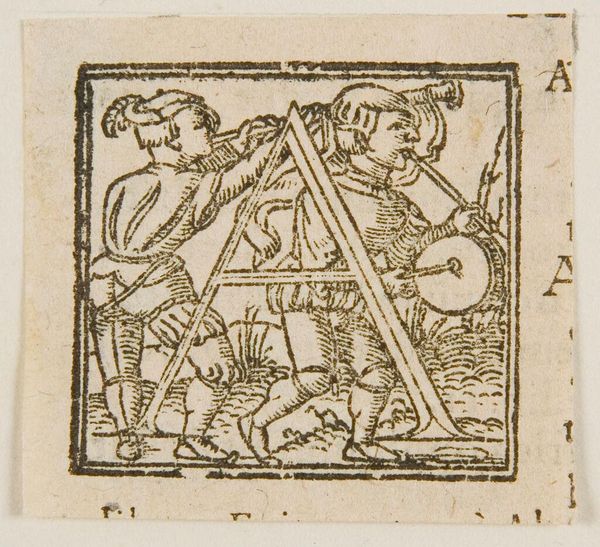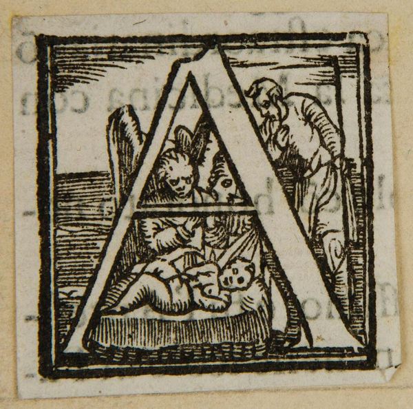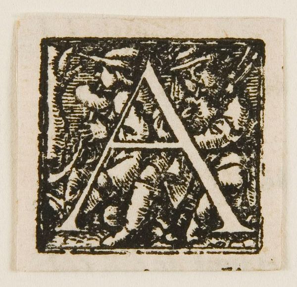 Curator: This diminutive woodcut, titled "Letter A," is an initial from an unknown printing house. It's part of the Harvard Art Museums collection, and its original purpose was functional, part of a larger text. Editor: It feels a bit grim, doesn't it? The letter A itself is so bold, but the scene depicted within feels heavy, almost tragic. Curator: Indeed. We see several figures – some seated, others engaged in what appears to be a conflict, perhaps a judgment scene of some sort. It asks us to consider power dynamics. Editor: Absolutely. Who is judging whom? And who is being silenced or erased in the process? The artist is using familiar tropes to comment on power and privilege. Curator: It's fascinating how even something as seemingly mundane as a letterform can be imbued with such social and political weight, don't you think? Editor: Yes, it underscores how even in the most utilitarian objects, narratives of dominance and resistance can emerge.
