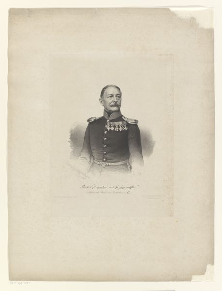 Editor: This is "Portret van een officier," or "Portrait of an Officer" by Adrien Canelle. It's a photograph dated sometime between 1851 and 1894. The detail is quite amazing, almost like a drawing. What do you see when you look at this image? Curator: I'm immediately drawn to the materiality of the image. Look at the process that went into producing this: the collodion process, the silver nitrate. Think about the labor involved in setting up the shot, preparing the chemicals. It's not just about capturing a likeness. It is an intensive material performance. Editor: That’s fascinating. It's easy to overlook the process when it looks so... classic. Curator: Exactly. The 'classic' aesthetic itself is a product of its material conditions and social context. This officer's uniform, his bearing – these are carefully constructed images reflecting power dynamics. What's he telling us about military rank and social aspiration? How does the photographic process either reinforce or undermine that? Consider how mass production influences how portraits were made at the time. Editor: It is interesting to think of how the materials influence not only the art-making but the image portrayed too. It feels almost propagandistic. The photo itself gives this man a certain authority just by existing, and its inherent reproducibility must have given it an immediate advantage for its purposes. Curator: Indeed, think about the availability of materials, how the industrialization of photography made images like these accessible. Consider, how does it challenge the hierarchy between painting and this emergent mechanical medium? It disrupts the established social structures surrounding image making. Editor: That definitely reframes how I see this portrait. It makes me think about accessibility, and the social implications of image creation in a completely new light. Curator: Precisely, analyzing the materials opens up questions of production, access, and representation. It moves beyond a simple portrait and asks what the image _does_ in the world.