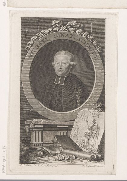 Curator: Let's turn our attention to a portrait here at the Rijksmuseum. It’s an engraving titled "Portret van Joseph Haberkorn von Habersfeld," dating from sometime between 1785 and 1858. Editor: Immediately, what strikes me is the formality and meticulousness of the piece. Look at the intricate lines – it speaks of deliberate labor, the patient carving into the plate. There’s also a contrast between the smooth oval frame and the textures it encloses. Curator: Exactly. The oval format itself is loaded. Think of Roman cameos and classical ideals of virtue. This shape lends an aura of enduring dignity, reflecting Haberkorn's status. Notice how the bow at the top mirrors the floral decorations beneath the inscription, visually framing the individual within layers of symbolic recognition. Editor: That bow and those floral ornaments seem at odds with the rigidness of the engraving, though, a subtle gesture towards the rococo perhaps, lingering despite the ascendance of Neoclassicism. But let’s consider the economics here; engravings like these served as vital modes of distributing images. How do we interpret this relative ease of reproduction? Curator: Reproduction, for this image, cements a social position, ensuring the likeness of important figures spreads. We must also consider the man represented within the frame: Joseph Haberkorn, prominently named, clearly intended to be recognizable to his contemporaries. These are deliberate cultural acts, fixing an identity through visual and textual information. Editor: But the engraving process itself demands specific tools, specialized knowledge. Copperplate engraving, as I understand it, allows for finer lines than woodcuts, indicating a certain level of craftsmanship and investment into the tools and training to achieve this delicate rendering. Curator: Precisely. That craftsmanship supports and magnifies Haberkorn, turning his presence into something memorable and lasting, even didactic. These portraits become public representations, reinforcing the power structures of the day. Editor: Fascinating how this method connects the individual portrayal with wider access and distribution while requiring a specific, class-bound material practice. Curator: In a way, then, the visual and material coalesce. Editor: Leaving us to rethink traditional boundaries in how we appreciate both craftsmanship and image production in service of social power and remembrance.