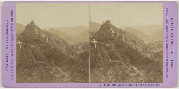 Curator: This stereo card, a photograph titled "View of Altenahr with the Hotel Winkler and the ruins of Burg Are, Germany," was captured by Johann Friedrich Stiehm between 1869 and 1872. It provides a glimpse into the romantic German landscape. Editor: It's evocative, almost dreamlike in its composition. The pale sepia tones and the stark contrast create a scene that feels both real and strangely distant, doesn't it? Curator: Absolutely. This image operates within a larger visual culture that celebrated German identity and landscape. Photography during this era was instrumental in constructing notions of national pride, aligning with both the Realist and Romantic movements in art. The carefully chosen vantage point, the hotel situated below a ruined castle, speaks to specific class experiences. Editor: I’m intrigued by that juxtaposition of leisure and ruin. Is it glorifying tourism, while perhaps unconsciously revealing the social dynamics? Those enjoying the hotel are positioned in direct contrast to the castle ruins; their social standing has replaced former residents. What about those figures strolling along the road in the foreground, almost anonymous within this carefully constructed scene? Curator: Precisely. These photographic views, often produced in series and widely circulated, shaped perceptions of places like Altenahr. Think about the infrastructure of tourism being established and catered to elite groups. Hotels became social markers, part of the experience. The ruin itself is picturesque—signifying history but controlled. Editor: It also raises the question: whose history is being valued and who has the privilege to enjoy that history? Curator: Definitely a pointed consideration. This stereo card isn't merely a neutral document; it’s an object embedded in layers of social and economic contexts. By considering who made it, for whom, and why, we get to see a past shaped and framed for very specific consumption. Editor: It goes beyond simple nostalgia; the framing and the content reveal more than a picture postcard. This photo becomes an important reminder about the complexities of historical interpretation. Curator: I agree; this "View of Altenahr" invites us to delve deeper into the socio-political context that gave it shape. Editor: For me, reflecting on what this image is doing rather than only seeing what is on the surface, it opens avenues for dialogue and invites critique about landscape, access, and how we narrate the past.