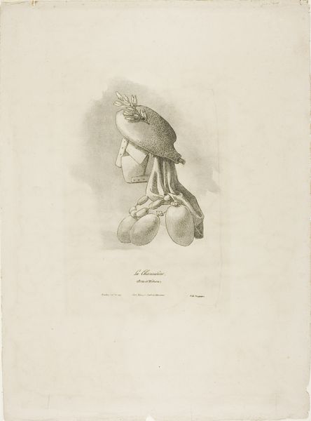 Curator: This lithograph, "The Tailor, from Arts et Métiers", created around 1838 by Bernard Gaillot, presents a fascinating, almost surreal, depiction. The work belongs to a series exploring various trades. Editor: It definitely has a strange beauty to it. There's something unsettling in how the tailor's head is completely encased in this... apparatus. What's the function of the bag at the bottom of the form, tied below what must be the neck? Curator: Precisely. The series from which this image comes sought to document different crafts. The "portraits" featured the working class men and women masked by specialized safety headgear—partly, it is believed, due to an outbreak of phthisis in France at that time. Gaillot’s composition subtly nods toward the increasing social awareness of public health risks in labor-intensive jobs. Editor: So, beyond its function as protection, this headgear essentially becomes a symbol of the alienation of the worker from their own identity. Their face, their individuality, obscured. We see only the tools, or safeguards, related to their trade defining them. Curator: Exactly! This image encourages a dialogue between class, industrialization, and perhaps the early formation of worker's rights. These masked figures raise important questions about how the burgeoning industrial economy reshaped not only work, but also social hierarchies. Editor: The facelessness truly emphasizes that—turning them into almost automatons, reflections of capitalist enterprise rather than individuals. There's a haunting power in that visual metaphor. It also reminds me how we classify professions based on associated regalia like the hardhats of builders, etcetera. Curator: I agree; this work, though seemingly straightforward in its depiction, resonates powerfully with themes of labor, identity, and the public health consciousness of the 19th century. Editor: And it certainly prompts reflections on how those dynamics continue to evolve and shape our present.