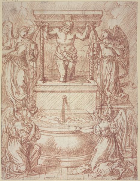 Curator: Let’s take a closer look at Dionys van Nijmegen's "Ontwerp voor een decoratieve schildering met een fontein," dating anywhere from 1715 to 1798. What strikes you first about this baroque drawing? Editor: The monochromatic feel really contrasts with what I think of when I imagine decorative fountains. It’s like a ghostly echo of opulence, a draft of a dream of abundant water. Curator: That's interesting. The dream analogy feels right. As a "design for a decorative painting," it uses pen, colored pencil, and watercolor to illustrate what might then be realized in stucco or even actual hydraulics. This drawing is a proposed design, but we are left with just that: a proposal. Editor: Precisely. It brings to mind the whole system of skilled labor involved, not only van Nijmegen, but the artisans needed to execute such a design. We're left with the imagined skill rather than the embodied, practical expertise of making something that lasts. And I do find that a bit sad. Curator: You're right; this hints at lost skills and forgotten collaborations. It's interesting that you consider it to have melancholic associations, whereas for me the allegory enlivens this image and its narrative, almost breathing life into stone! The artist gives depth to these otherwise muted materials by positioning figures from mythology in dialogue with one another, creating an atmosphere of storytelling through water. Editor: Oh, yes, I definitely see that. But think about how each part would be crafted and put together – consider the labor needed to sculpt those figures or manage the water flow in the basins... and, in this representation, it is all still quite inert. I mean it's a plan more than a promise of a working structure. Curator: Well, I'm taken by its incompleteness! It leaves my imagination lots of room to play in deciding what kind of setting or occasion this drawing might inspire! Ultimately I see possibility and your perspective adds a much appreciated consideration of production in realizing the object. Editor: Exactly. In our different readings of its making, this image highlights not only artistic expression but the societal processes behind realizing such creations, an exciting glimpse into past aesthetics!