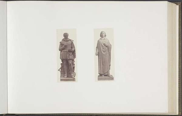 Curator: These facing images by Édouard Baldus capture plaster models destined for the Palais du Louvre, created around 1855 to 1857. On the left, we see Antoine Desboeufs’ depiction of Voltaire, and to the right, Louis Desprez’s Bossuet. What leaps out at you? Editor: A sense of profound separation. The way they are framed isolates them, two thinkers almost tragically alone, despite facing each other. The empty space hums. Curator: Indeed, there’s a beautiful, melancholic solitude to them. Both men represent powerful, albeit conflicting, voices of their time. Voltaire, the champion of reason, faces Bossuet, a staunch defender of divine right. These weren’t merely portraits; they embodied ideological positions. Editor: The contrapposto in Voltaire’s stance emphasizes this. He’s caught in motion, mid-stride perhaps, or caught with new thought - dynamic even in plaster. Whereas Bossuet feels intentionally still, monumental, self-contained in his certainty, that classical pose a marker of established authority. Curator: The use of photography to document sculpture introduces an interesting layer, wouldn't you say? Baldus immortalizes these ephemeral plaster figures, destined to be translated into something grander, permanent perhaps in stone. It's a study of process, an ode to transformation. Editor: Absolutely! Light seems to caress these figures, breathing transient life into these interim sculptures, when actually stone usually wants to emphasize endurance, the immutability of belief itself. I notice too how these gentlemen hold tomes—as objects the words within take a second place. They embody thinking by gesture as well as implication. Curator: Looking at them like this offers a glimpse into a moment of potent intellectual and aesthetic ambition, of these thinkers facing each other but forever divided by how they see and experience the world. They're reminders of enduring dialogue. Editor: A reminder that thought immortalized often reveals just how human, and contingent, our most deeply held convictions can be. A compelling mirror to our own quest for meaning, and it is good food for thought today.