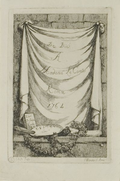 Editor: This is "Titelprent voor de serie platen van de viering van het tweede eeuwfeest van de Utrechtsche Hogeschool," created by Huib van Hove Bz in 1836. It's an etching and engraving. I'm struck by its theatrical quality – the heavy curtains, the central scene... it's like looking at a stage. What do you see in this piece, considering its historical context? Curator: I see a visual manifestation of institutional self-aggrandizement, deeply embedded in the political and social climate of the 19th century Netherlands. Consider the timing: 1836. The Dutch monarchy was relatively young, and institutions like the University of Utrecht were vital in shaping national identity. This print isn't just commemorating an anniversary; it's constructing a specific narrative about the university's role in Dutch history. Editor: So the almost dramatic presentation is intentional? Like propaganda, in a way? Curator: Precisely. The heavy drapery, the angelic figure bearing a commemorative plaque - these are all elements designed to elevate the university to almost mythical status. Notice the scene within the "stage" – it probably depicts a key moment in the university’s history, linking it to national events and figures. It is essential to acknowledge how history is curated and presented, particularly in publicly-funded institutions. Do you notice how the choice of imagery legitimizes authority and reinforces power structures? Editor: I hadn't really considered it that way. It's like they're trying to write their own history, or at least control the narrative. It really does seem performative now that you point that out. Curator: Indeed. These images played a crucial role in shaping public perception. They were a powerful tool for fostering a sense of national pride and institutional loyalty, subtly influencing the political landscape. Editor: I definitely have a better understanding of how art can serve purposes beyond just aesthetics, and how power and institutions affect its display. Curator: And that understanding, that critical perspective, is essential for navigating the visual world we inhabit.