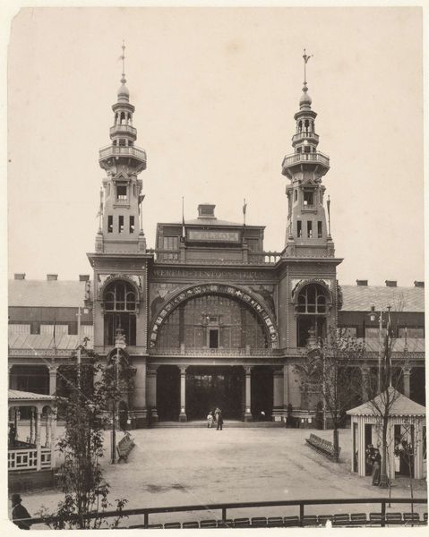 This photograph of the Stadsschouwburg in Amsterdam, taken by Gerrit Hendricus Heinen, captures a moment in the life of the city. Heinen's work, like all photography, is inherently tied to the industrial processes that make it possible. Photography democratized image-making in a way that artisanal skill never could. Here we see the Stadsschouwburg, its brick façade and ornate details rendered in tones of grey. The texture of the print itself, smooth and matte, contrasts with the building's complex surface. The image is not just a record of a building, but a document of a social scene: figures mill about, horse-drawn carts line up. The photograph is a result of Heinen's skill, but also the labor of those who manufactured the materials, and the technological innovations that made photography accessible. By considering the materials and social context of this photograph, we can appreciate its historical and cultural significance, blurring the lines between art, craft, and industry.