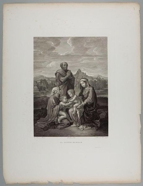 Editor: This is Francesco Rosaspina's "Madonna and Child with Saints", a print held at the Harvard Art Museums. I'm struck by the balance in the composition, but also the stark contrast between the softness of the figures and the rigidity of the architectural setting. What do you make of this contrast? Curator: The visual tension arises, I believe, from Rosaspina's precise linearity. Consider the lines defining drapery and figures—each contributing to the work's rigorous formal structure, setting up a tension between the organic and the constructed. Editor: So, you're saying that the contrast isn't so much thematic, but more about the artist's style itself? Curator: Precisely. Rosaspina uses line to create form, and that form, however realistic, is fundamentally structured. Editor: That's fascinating; I never considered the lines themselves contributing to the mood. Thanks for sharing your perspective. Curator: It's in such formal considerations that the artwork reveals its artistic intent.