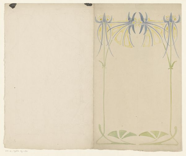 Editor: Here we have Jan Toorop’s cover design for Louis Couperus’ *Psyche*, dating from before 1898. It’s rendered in ink on paper and now resides in the Rijksmuseum. The delicate lines and floral motifs create such an ethereal, almost dreamlike quality. What stands out to you as you examine this design? Curator: Well, consider the role of book covers at the turn of the century. This was a time when art and design were increasingly democratized through mass production, and the book cover became a site where avant-garde ideas could reach a broader public. How do you see Toorop's design engaging with this social trend? Editor: I guess I see how it moves beyond purely functional design and attempts to elevate the book itself to a piece of art. Curator: Precisely. And that elevation speaks to a desire to imbue everyday life with artistic value, aligning with the broader Arts and Crafts movement and the rise of Art Nouveau. Also note the stylized rendering of the female figure – how might her pose and surroundings speak to prevailing attitudes toward women and representation at this time? Editor: She looks so entwined within the landscape. Maybe it’s suggesting the interconnectedness of women and nature? Curator: It could be seen as that, yes, echoing symbolist themes. The book itself then becomes a kind of cultural artifact reflecting both artistic innovation and the societal values of its time. How might we also view the positioning of the title? Editor: The font feels so intentional! It's very much part of the decorative scheme of the whole cover design, not separate. Almost as if the book is meant to stand apart. Curator: Exactly. The deliberate positioning amplifies the role of art in reflecting the aspirations and cultural values of its era. The integration is very important. What did you learn overall? Editor: I never considered a book cover in this light, as a visual statement. I mean, I guess I always thought of it as sales, but you're right. This is more important than selling; it is documenting society! Thank you.