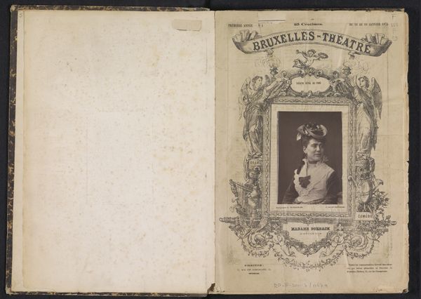 This is a photograph of Mario Widmer in “La Fille de Madame Angot,” made by Hector de Saedeler. The image is printed on paper, likely using a combination of photographic and lithographic techniques, as indicated by the “typo-lithographique” note nearby. The visual impact relies on the contrast between the crisp photographic portrait of Widmer and the elaborate, almost baroque printed border. This combination of technologies speaks to a moment when photography was still relatively novel, and printing processes were being refined for mass production. The border itself, teeming with cherubs and floral motifs, probably required skilled hand work on the lithographic stone. By placing Widmer within this ornate frame, the image elevates him, associating the actor with the grandeur of the theater. This image, created through a blend of photographic precision and lithographic artistry, highlights the intersection of art, commerce, and the burgeoning culture of celebrity. It reminds us that even seemingly straightforward portraiture involves complex layers of production and cultural meaning.