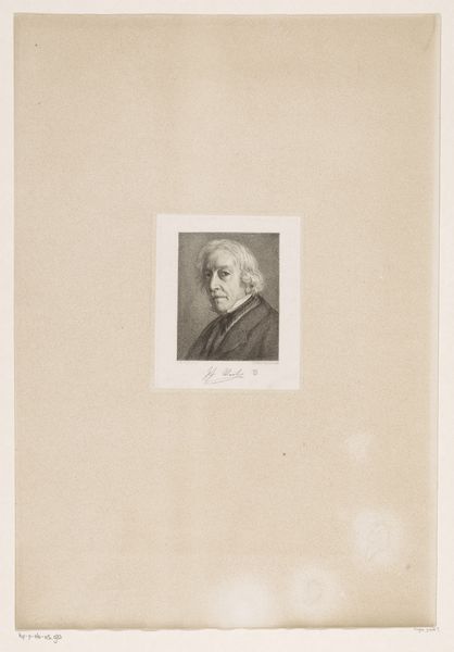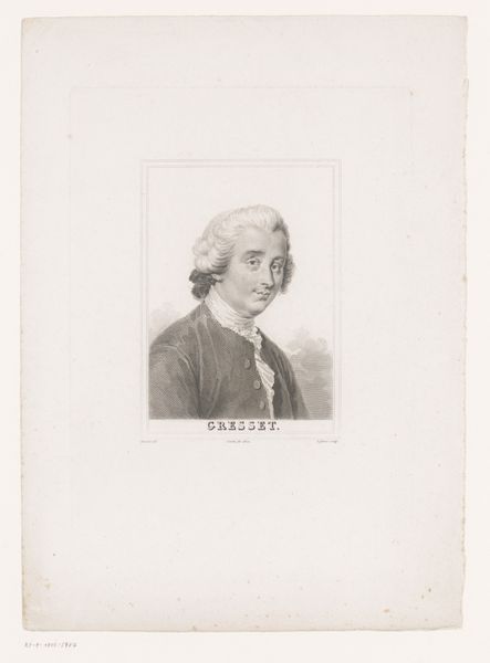 This is Anton Heinrich Riedel’s small portrait of Pietro Rotari, made with etching. The piece has a formal quality from the symmetrical composition, sharply defined edges, and linear precision. The subject’s gaze meets ours head-on; this creates an immediate sense of connection. The soft rendering of Rotari's features and wig contrasts with the sharp, controlled lines defining his jacket. Here, line and form intersect with ideas about representation and identity. Etching, as a medium, allows for the mass production of images, so it challenges notions of the unique and original artwork. Consider how the very act of portraying Rotari through reproducible means reflects the Enlightenment ideals. This work encapsulates a period of transition in artistic practices and philosophical thought.