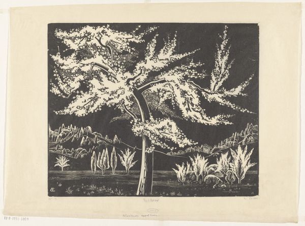Curator: Welcome. We're looking at Johannes Frederik Engelbert ten Klooster's 1919 woodcut print, "De rustplaats," or "The Resting Place." Editor: Oh, wow. That massive tree dominates everything, doesn't it? The stark black and white gives it this sort of ominous, fairytale feeling, like something out of the Brothers Grimm, but maybe in a hotter, stickier jungle setting. Curator: It's a rather intense landscape, indeed. Observe how ten Klooster masterfully employs the woodcut medium; the contrast heightens the sense of depth and drama. See how the meticulous cutting technique delineates individual leaves and the gnarled texture of the trunk? Editor: Mmhmm, that granular effect adds texture almost you can touch. It is kind of a funny spot to rest at when it's like a tropical, gothic place to relax with so much chaotic visual noise all competing with one another, right? Also, that little cart almost lost among all those leaves. Maybe I shouldn’t trust them! Curator: The small figures and the cart do introduce a narrative element, hinting at human interaction with nature. Notice how the formal arrangement is structured around the visual tension between light and dark, a crucial characteristic of expressionist printmaking. Editor: Absolutely. Expressionistic— I get that. I can’t help but feel this sense of the relentless power of nature overwhelming us, which feels a bit anxiety-inducing if I try to relax. Does that make sense, though? A kind of paradise fraught with pressure? Curator: Perhaps the pressure to confront nature's sublime indifference, its relentless generative force divorced from human concerns. But let’s move past the symbolic content and return to the pictorial organization of ten Klooster's work, for a second. Editor: Sure, yeah, stepping back from the overall vibe. Curator: How ten Klooster's masterful linework manages the simultaneous impressions of intricate detail and monolithic mass. The artist clearly invites our attention to it! Editor: You know, after noticing the cart and folks, maybe they really did earn their time off because nature seems almost threatening! Curator: An evocative perspective on the picture. Thank you, truly. Editor: Thank you! I will definitely sleep with the lights on.