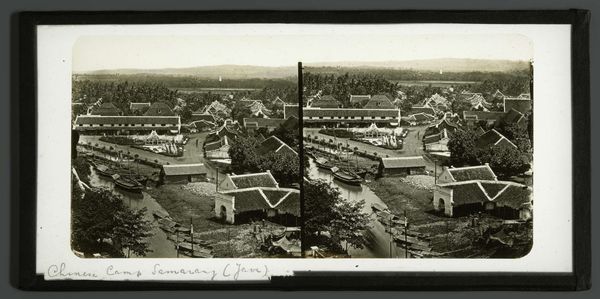 Curator: Allow me to introduce "Straat in Semarang," a compelling albumen print made sometime between 1857 and 1864 by the studio of Woodbury & Page. Editor: My initial impression is one of stark formality; the repetition of those rectangular buildings, coupled with the monochromatic tones, generates a strong sense of order and perhaps a subtle feeling of detachment. Curator: Indeed. This photographic document speaks volumes about the Dutch colonial presence in Indonesia at that time. Consider how this meticulous rendering of a Semarang street constructs a certain image of governance and control. Editor: The perspective is key. We are positioned above the street, an implied power dynamic placing the viewer as the observer, neatly arranging elements. It’s interesting how the strong diagonal lines, created by the row of buildings converging, pulls you through the space. Curator: I agree; it’s a study in constructed visibility. Note the carefully arranged buildings—their architecture reflecting a clear European influence—juxtaposed against the implied, less visible local life happening beyond those facades. The photograph is now held in the collection of the Rijksmuseum. Editor: Let's focus on those buildings further, a formal sequence articulated with linear clarity—repeated vertical colonnades supporting horizontal roofs, asserting its presence with stark monumentality, doesn't it? How does the implied vanishing point interact with the perceived narrative? Curator: Good point. The albumen print’s sharp focus provides clarity but it obscures deeper historical tensions. Colonialism's reach goes far beyond merely reshaping a landscape, doesn’t it? It reframes societies through economic leverage and visible power. Editor: So, would it be valid to read this city street less as a neutral topographic record and more as an expression of colonial influence expressed through formal pictorial decisions and aesthetic means? Curator: Exactly. It's crucial to critically engage how such seemingly objective records worked actively in crafting and perpetuating imperial ideology. The ordering of space mirrored a wider social agenda. Editor: Considering the visual mechanics present, a fascinating dance between photographic image as information carrier, colonial ambition made solid, and a frozen moment to spark contemplation on deeper cultural tensions that linger within the frame.