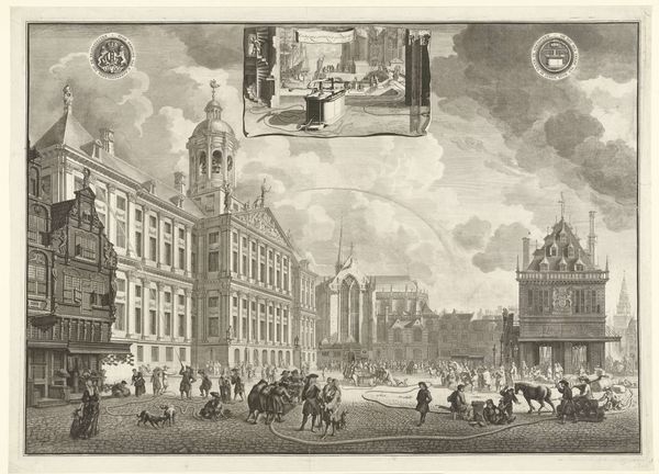 Jacques Rigaud created this print of the Château de Versailles, with its chapel, using engraving. Rigaud's print presents us with a carefully ordered view of the palace grounds, but it's not just a straightforward representation. The formal arrangement emphasizes the architecture's symmetry and scale, evoking a sense of grandeur and meticulous planning. Look closely at the interplay of light and shadow achieved through fine lines. Rigaud uses these to define forms and textures, creating depth within the monochrome palette. The composition divides the space into distinct zones, from the foreground figures to the background buildings, each contributing to the overall sense of structured harmony. This organization reflects the values of the time, where order and reason were paramount. Rigaud's print thus goes beyond mere depiction, functioning as a cultural document that expresses the period’s ideals and the power structures they supported. It captures not only the likeness of a place, but also the mindset of an era.