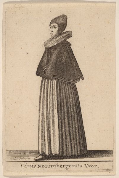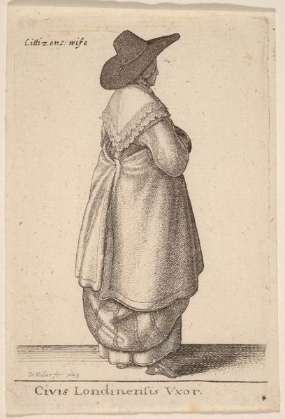 Wenceslaus Hollar created "Nobilis Mulier Anglica, in Vestitu Hiemali" using etching techniques. Notice how Hollar's masterful use of line and texture defines the figure. The density of etched lines varies to convey depth and the tactile qualities of different fabrics, from fur to heavy cloth. The composition is stark, focusing solely on the figure, which allows us to examine the details of attire. Consider the semiotic system at play; clothing as a signifier of status, gender, and identity. The elaborate winter dress speaks of cultural codes of modesty and social hierarchy. It invites us to interpret the subject's persona, positioning her within a complex framework of gender and status. The density of the cross-hatching not only models the form but also imbues the image with a weighty presence. This etching serves not just as a visual record but also as a commentary on the language of attire and its power to communicate identity.