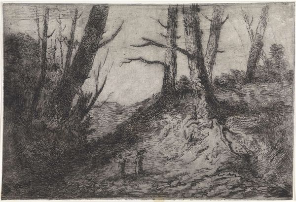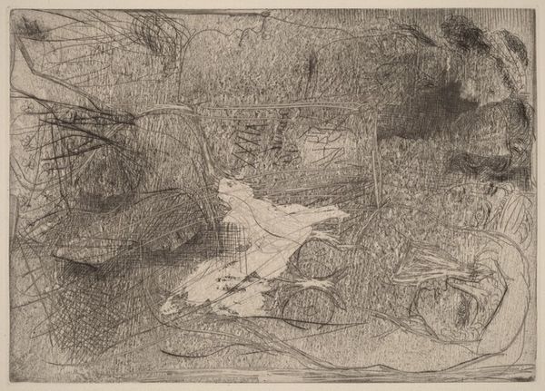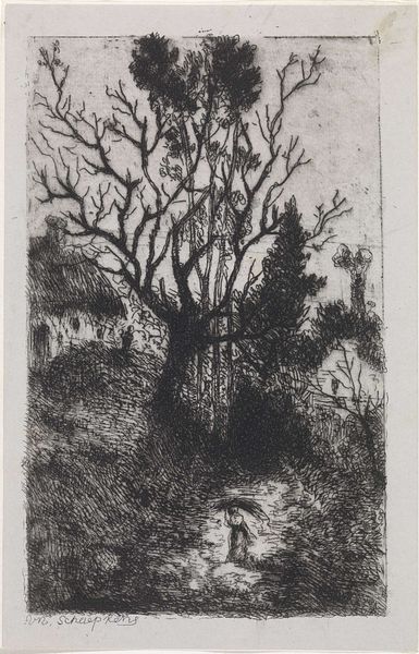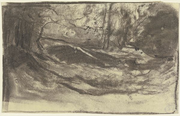 Curator: Let's consider Arnoud Schaepkens's drawing "Rotspartij," made sometime between 1855 and 1904. It’s an ink drawing. Editor: Oh, my! What a flurry of scratches. It gives the impression of an intimate chaos, a close-up of unkempt wildness, like sticking your nose right into the undergrowth and feeling lost. Curator: It's interesting that you pick up on chaos. It feels almost manic, but is there an attempt to symbolize order or nature's architecture? The style reminds me of realism with the attempt to accurately portray. Editor: Well, realism is about the world as we perceive it, right? This perspective seems not of grand vistas or carefully framed scenery but something more immediate and unsettling. Maybe this disorder reveals that "accurate" perception of wild nature entails recognizing its chaotic soul. Is there some cultural meaning, in this dark palette and agitated lines, something more profound? Curator: Perhaps it's not so much an invitation to get lost but a deliberate demonstration of how wild and untamed spaces hold intrinsic cultural importance. Perhaps Schaepkens aimed to capture more than just scenery. What is your reading of landscape artworks? Editor: Landscape speaks volumes to the people of a period. It reveals collective longing, shared anxieties... Here, I think the focus on texture and tangled shapes shows a symbolic anxiety about a nature overwhelming or concealing, devouring itself in shadows and growth. A dense world that borders on sublime dread. Curator: I love that idea: "sublime dread!" The way the lines mimic roots digging into the earth, and how these patterns emerge is interesting. To see this is to see the tension between wanting control over nature and acknowledging its uncontrollable force. Editor: And yet, maybe there's also an ecological premonition here... These frantic, consuming lines might echo, now, the dire feeling of environmental struggle; a reminder that imbalance has very old symbolic and visual languages that Schaepkens was on to. Curator: What a haunting yet powerful thought. We started seeing wildness and chaos and got to the climate crises... "Rotspartij" seems, after all, more meaningful now than it has ever been.